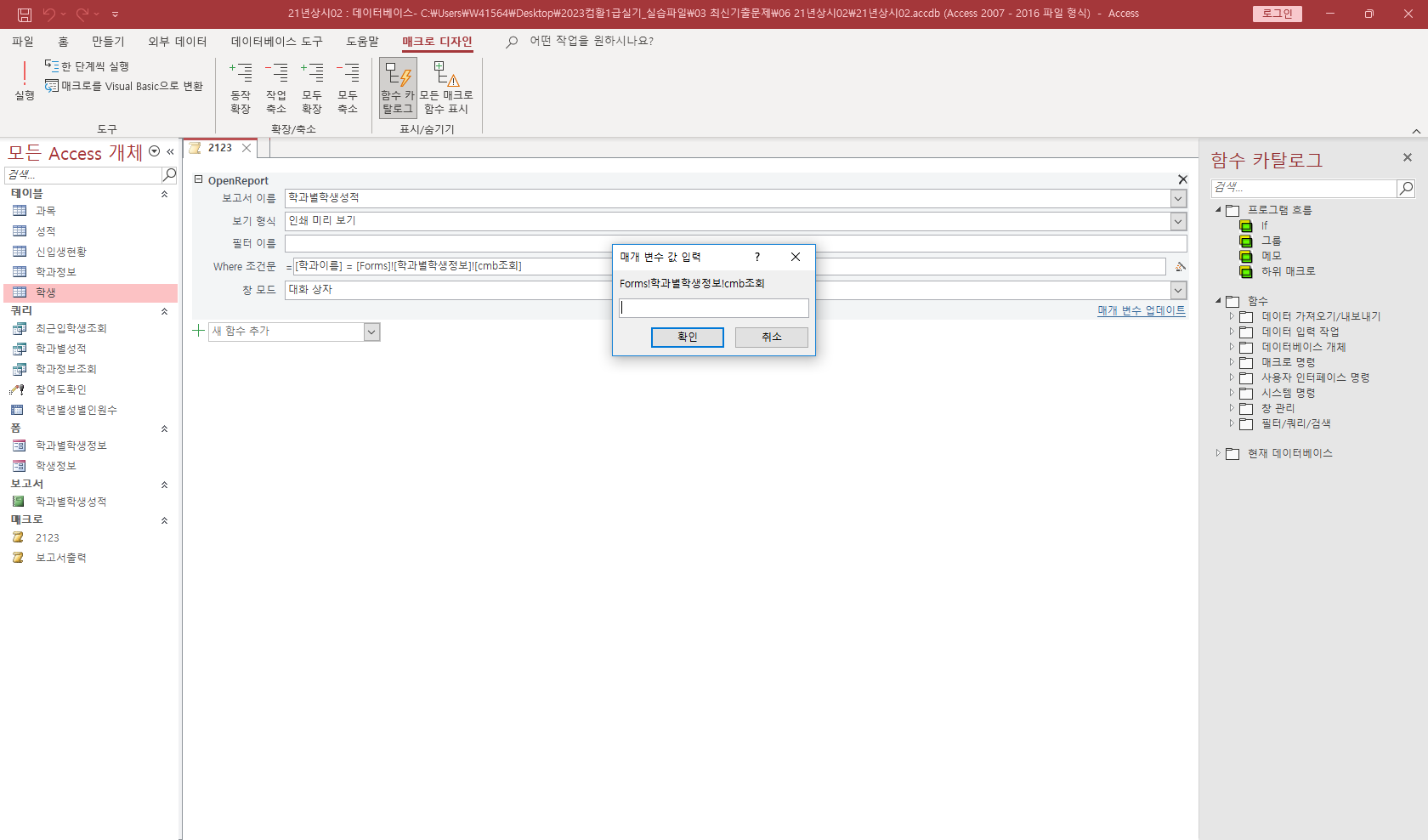 학과별학생정보 폼이 실행된 상태에서 cmb조회에 조회할 데이터를 선택한 상태에서 매크로를 실행해야 합니다. 매크로만 실행한 상태에서는 해당 컨트롤을 찾을 수 없어 오류가 발생합니다. 폼을 실행한 상태에서 다시 한번 매크로를 실행해 보시고, 그래도 오류가 발생한다면 실습한 액세스 파일을 올려주세요. 파일을 직접 열어 실행을 해봐야 원인을 알 수 있습니다.