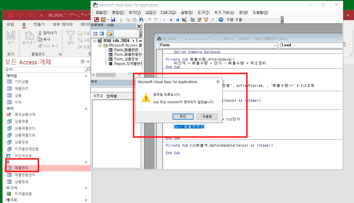 '매출관리' 폼을 실행해보시면 아래 이미지와 같이 오류가 발생되어 채점이 진행되지 않았습니다.