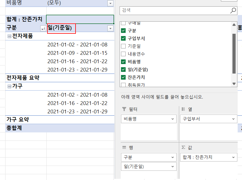 행에 기준일을 추가하고 그룹화를 했더니 (일)기준일로 바뀌는데 이것을 다시 기준일로 보이게 하려면 어떻게 해야 하나요?