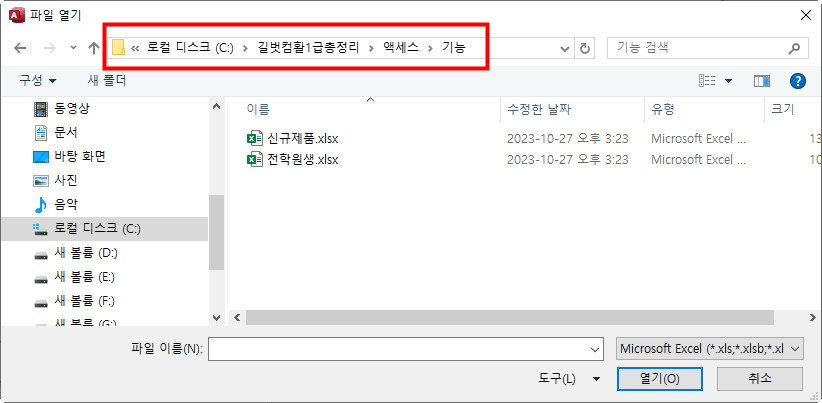 [외부 데이터] → 가져오기 및 연결 → 새 데이터 원본 → 파일에서 → Excel을 클릭한 후 ‘외부 데이터 가져오기 - Excel 스프레드시트’ 창 <찾아보기>를 클릭한 다음 폴더 위치를 아래 그림과 같이 지정하면 불러올 '신규제품.xlsx' 파일이 보입니다.