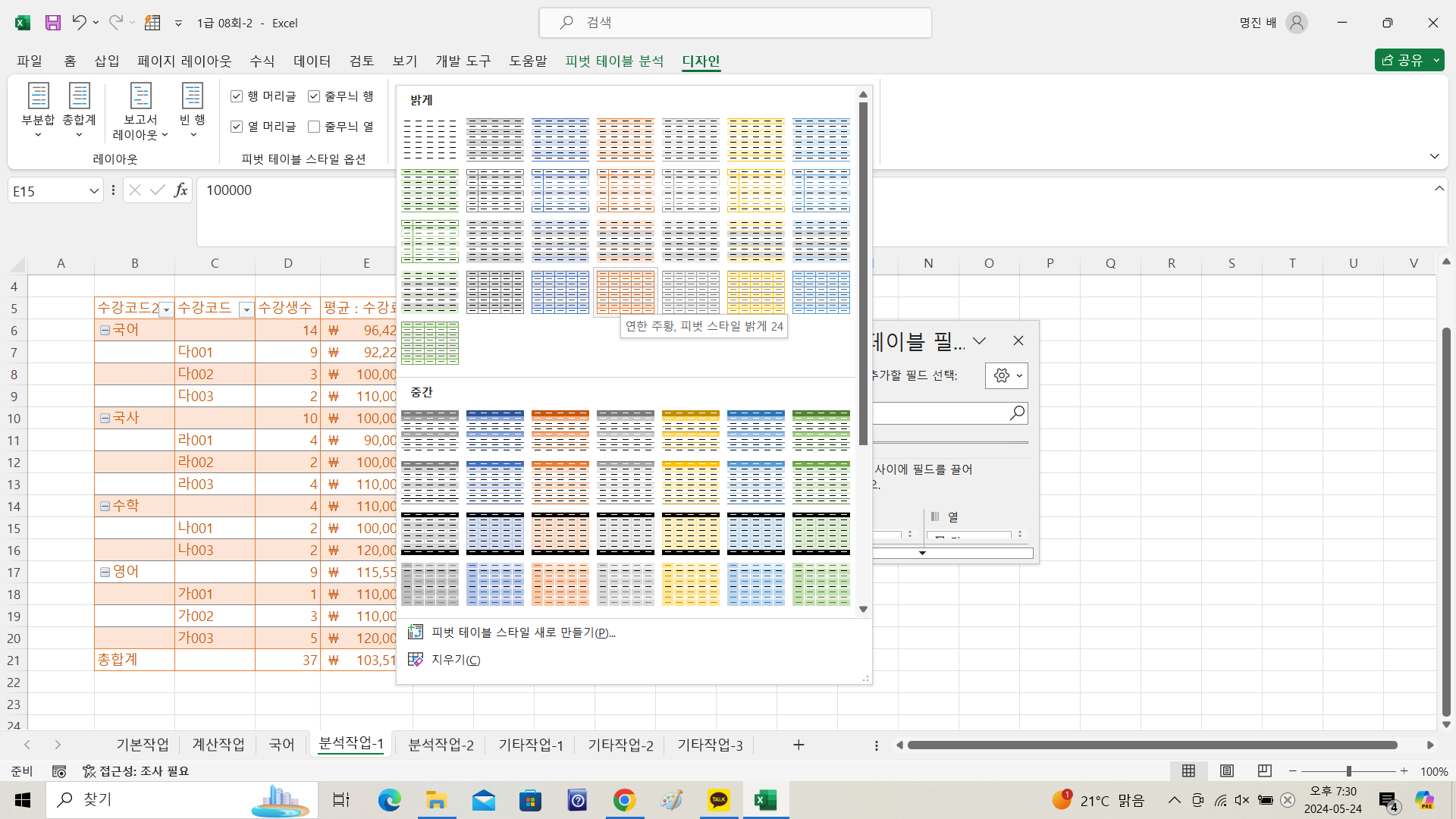 이 문항에서 엑셀로 들어가 작업을 해보면 연한주항, 피벗 스타일 밝게 24로 나오고 있습니다. 그 다음이 흰색 피벗스타일 밝게 25라서