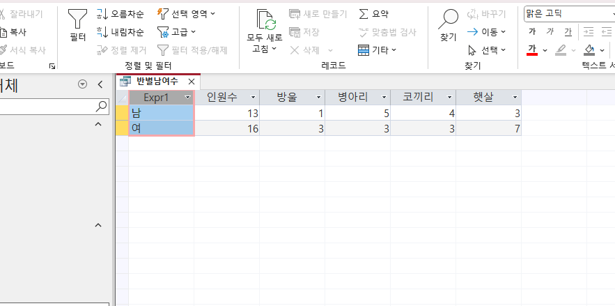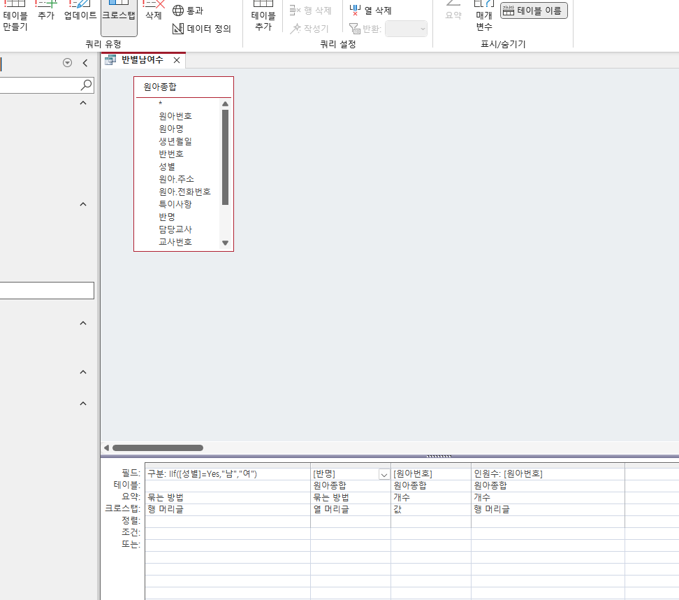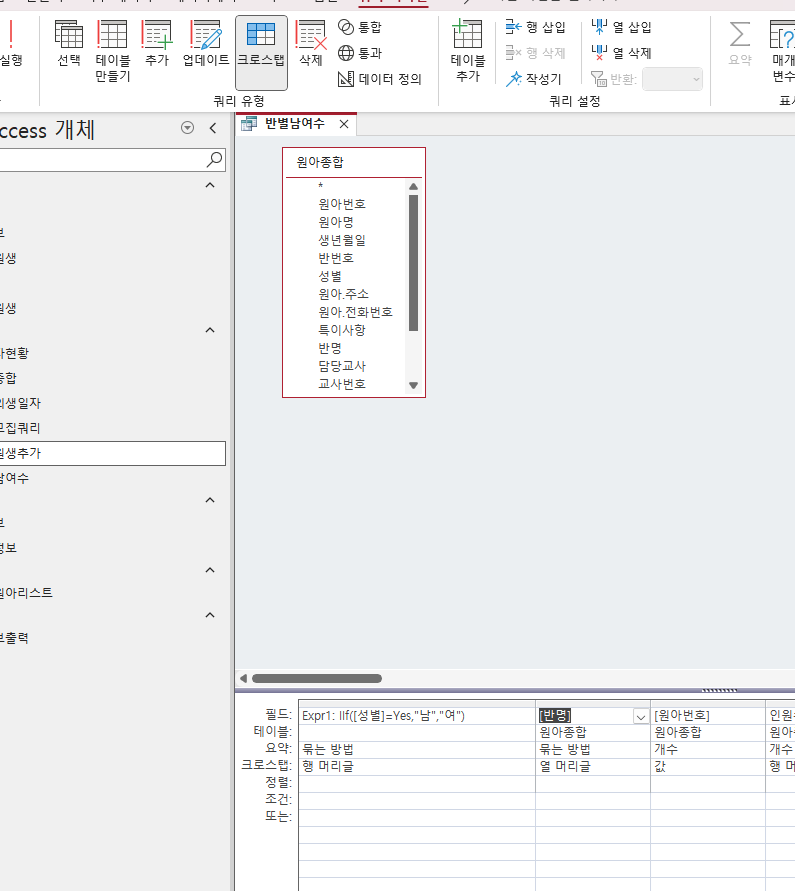 구분: IIf([성별]=Yes,"남","여") 라고 작성하면 남, 여라고 뜨지 않고