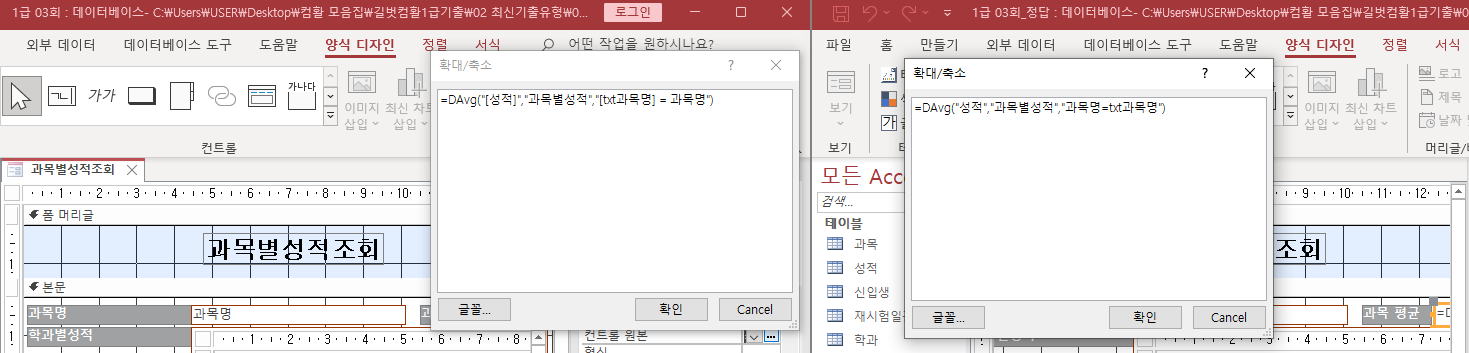 -"[txt과목명] = 과목명"))이 정답(=DAvg("성적"