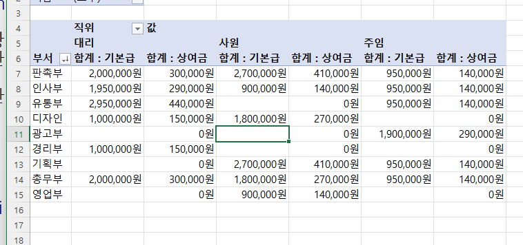 -피벗 테이블 결과 X [A8]에서의 값이 (인사부)로 정답(총무부)과 다릅니다.