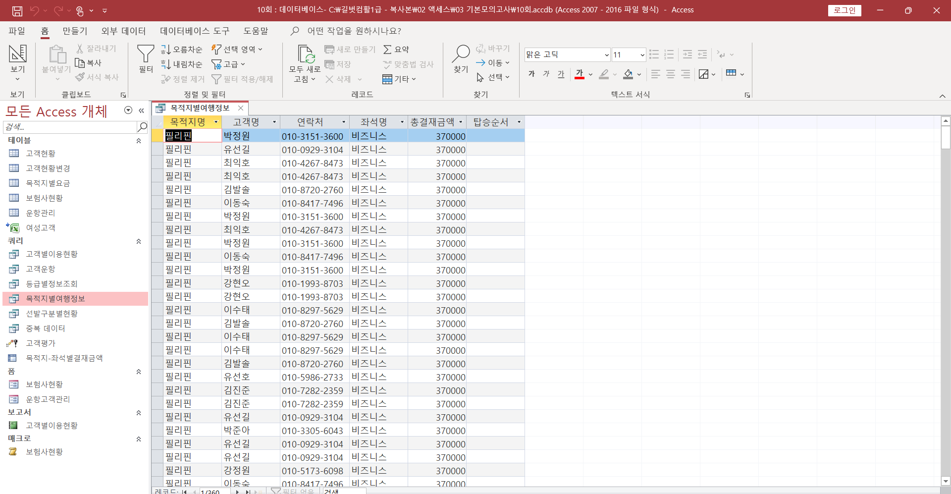쿼리에 삽입한 고객현황과 운항관리 테이블 간에 관계가 설정되어 있지 않다면 [문제1]-2번의 관계 설정 문제를 먼저 푼 다음 쿼리를 다시 작성하시기 바랍니다. 관계가 설정되지 않은 두 테이블을 사용할 경우 그림처럼 실행됩니다.