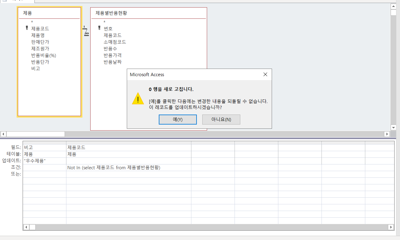 업데이트 쿼리는 데이터가 수정되는 제품 테이블만 추가한 후 작성합니다. 쿼리에 추가한 제품별반품현황 테이블를 삭제해 주세요.