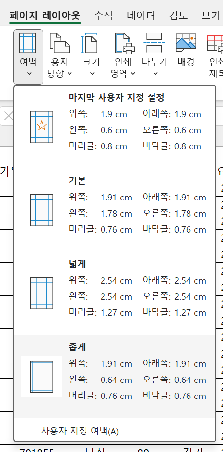 페이지설정-좁게 선택했는데, 문제점이 어디인지 궁금합니다.