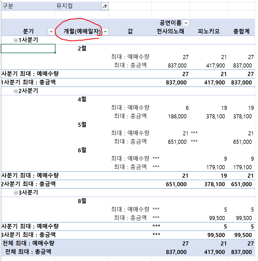 분기별, 월별로 그룹화를 하면 사진의 빨간동그라미부분처럼 되는데 어떻게해야 정답과 동일하게 되나요?