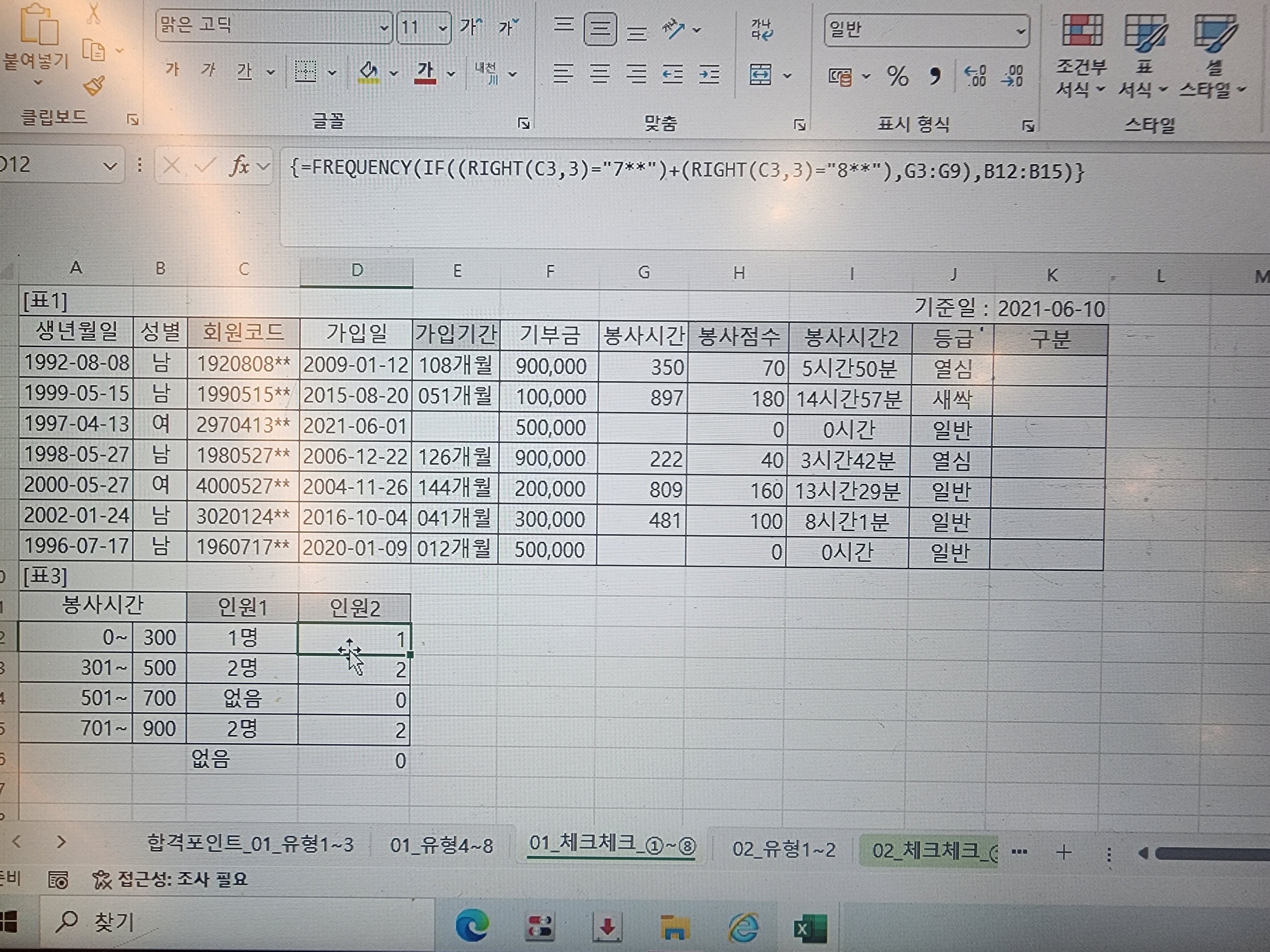2. [D12:D15] 영역을 블록을 지정한 상태에서 수식을 입력하여 한 번에 값을 구해야 하고 FREQUENCY 함수는 배열 함수로 범위를 c3:c9와 같이 배열로 지정해야 합니다. 즉, FREQUENCY 함수로 인해 범위를 배열로 지정한 것입니다.