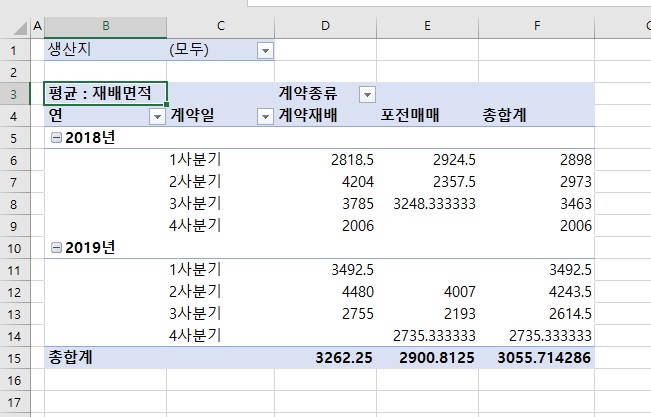 책 94p, 06 그룹 지정 작업 - [유형1]에서 그룹 지정을 하고 나면 행에서 계약일 밑에 년도, 그 밑에 1~4분기가 나타나는데