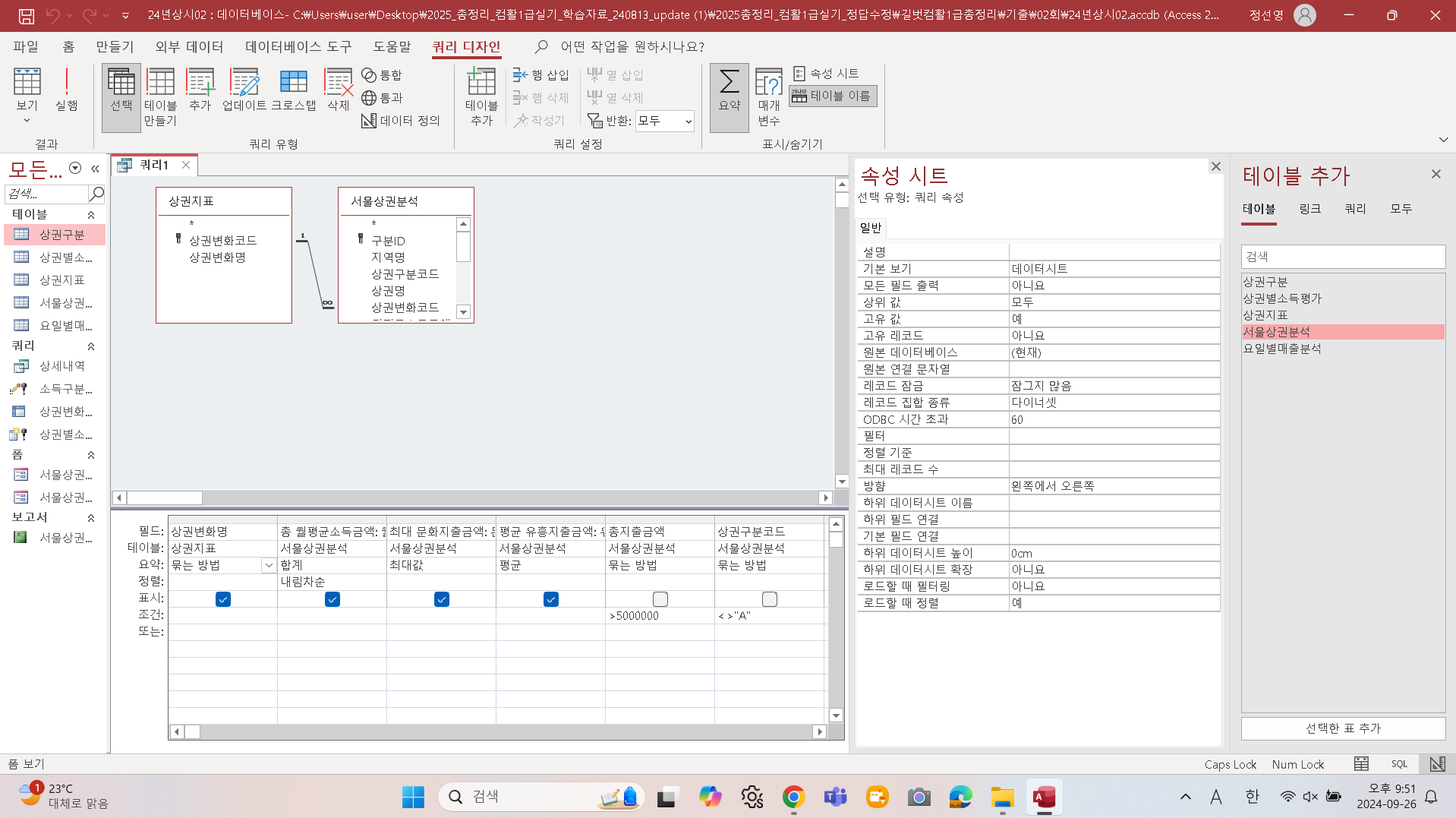 쿼리 작성기를 SQL로 변경하였을 때 '묶은 방법'은 GROUP BY, '조건'은 WHERE문에 해당합니다. '총지출금액'과 '상권구분코드'에 지정한 것은 조건이므로 <요약>을 '조건'으로 변경해야 합니다.