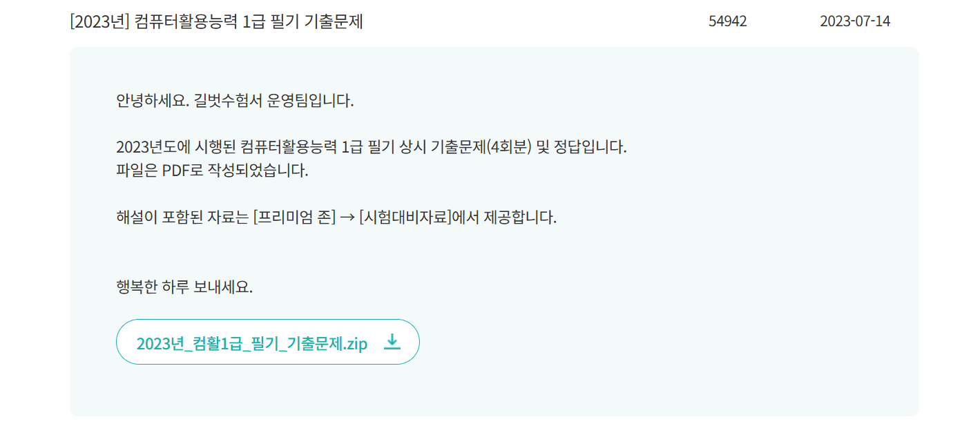 2023년 1급 필기 문제 PDF 비밀번호가 어떻게 되나요?검색해보니 첫장에 있다는 답변만 뜨는데 해당 PDF에는 모든 파일 첫장에 비밀ㄹ번호가 안 보여 문의드립니다