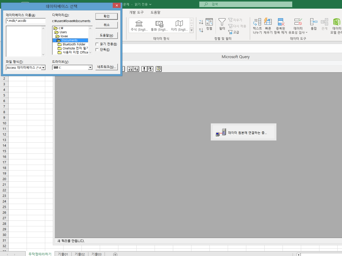 문제에서 <제품가공.accdb> 파일을 찾으라고 하는데 (데이터 가져오기)->(기타 원본에서)->(Microsoft Query)로 들어가게 되면 깃벌컴활 1급이라는 파일이 표시가 안됩니다.