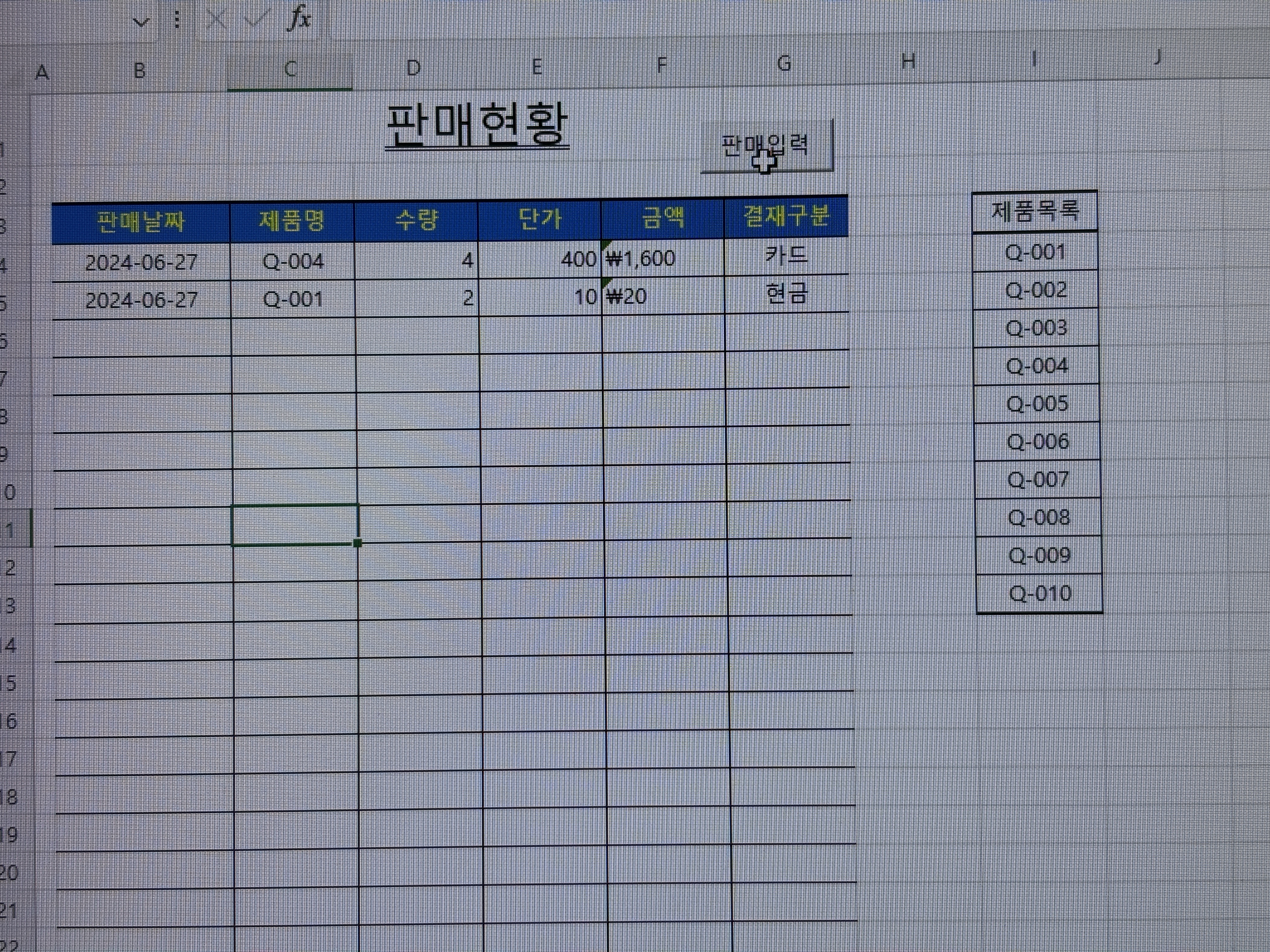 엑셀에서 프로시저를 작성하고 나서 판매입력 버튼을 클릭하려고 하는데, 마우스 커서가 화살표 모양이 아닌 하얀 십자가 모양으로 뜨고 버튼 클릭이 안 됩니다.