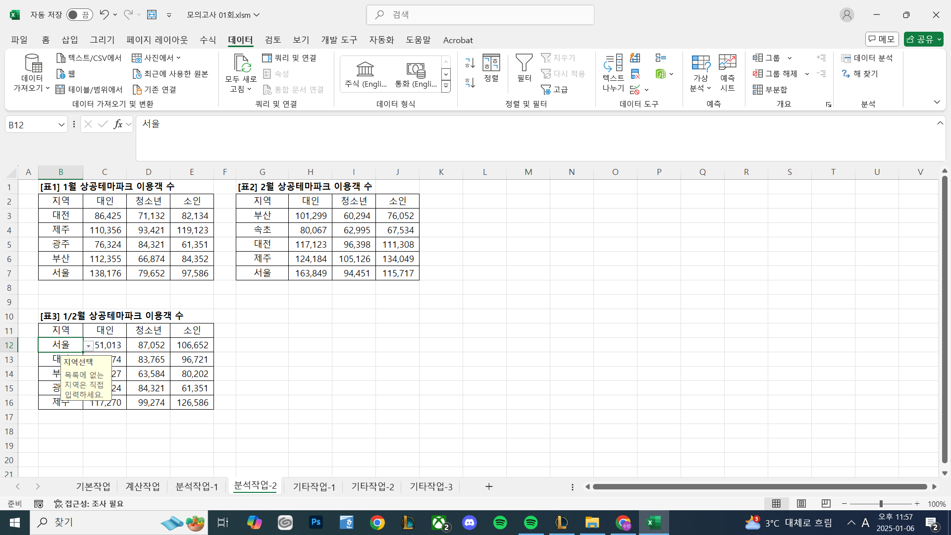 분석작업 -2 에서 문제에 하라는대로 표3에도 유효성 검사규칙을 설정했는데 안되어있다고 채점 오류가 뜹니다.