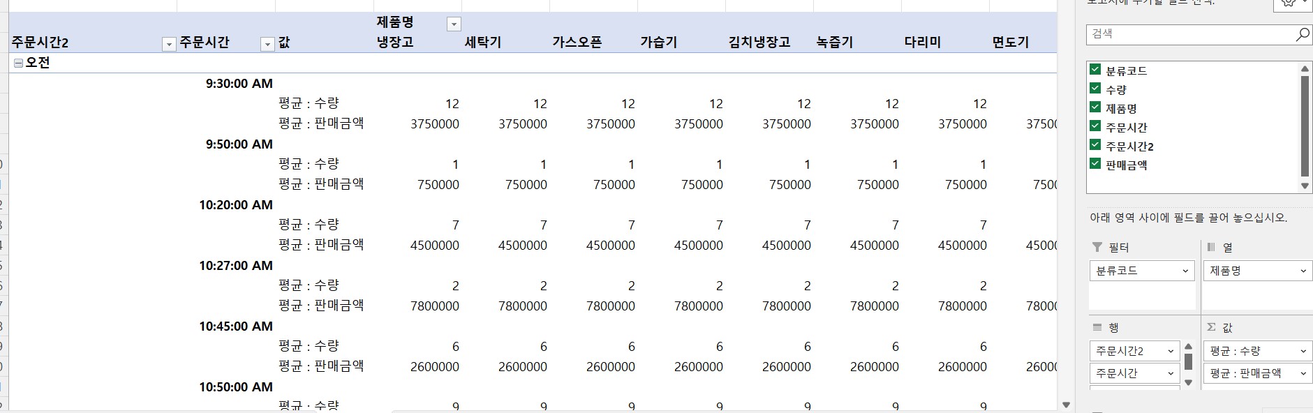 다름 아니라 유튜브 영상 보면서 똑같이 따라서 피벗테이블 위치도 영상이랑 같게 위치시켰는데