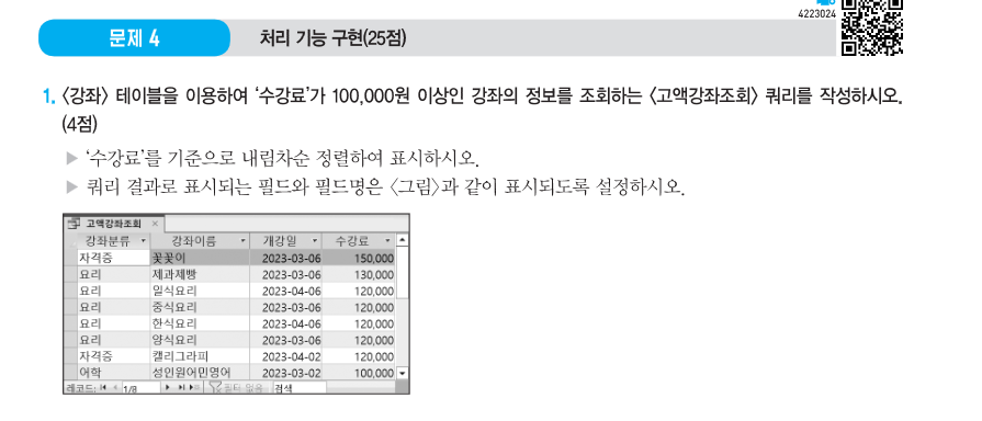 문제에는 고액강좌조회로 나오는데 체점결과에는 강좌횟수조회로 나옵니다