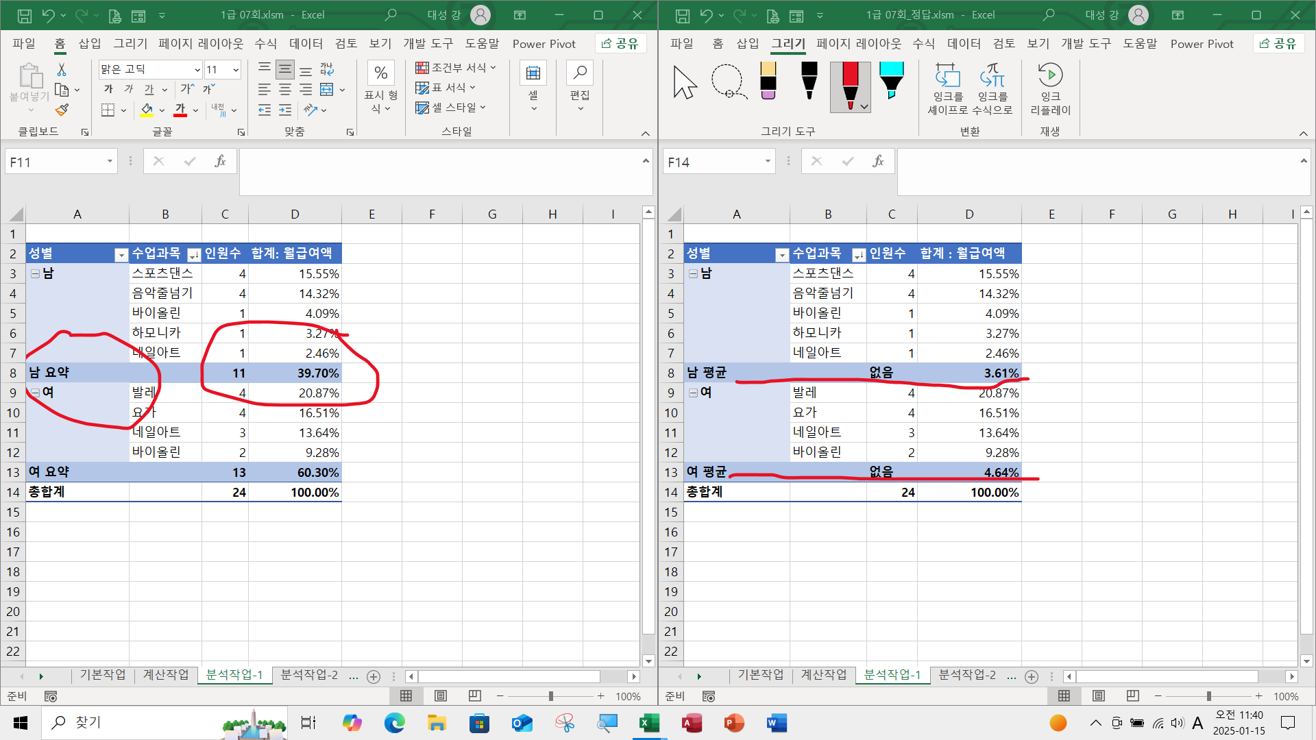 강*성2025-01-18 10:22:16감사합니다 삽입-피벗테이블 아니고 데이테-가져오기 경로로 실행하니 사용자 지정이 활성화 되데요. 그런데, 인원수 평균이 60.???/로 계산되어 나옵니다 제가 좀 더 공부해야 될 듯. . .
