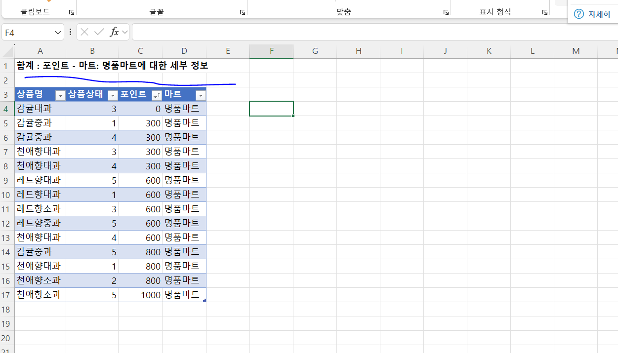 -시트 비교 X [A1]에서의 값이 (합계:포인트-마트:명품마트에대한세부정보)로 정답(상품명)과 다릅니다.
