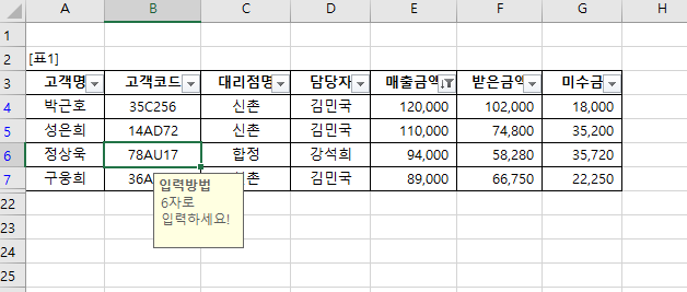 -데이터 유효성 검사 X 유효성검사 규칙 범위1 값(=LEN($B4)=6)이 정답(=LEN(B4)=6)과 다릅니다.