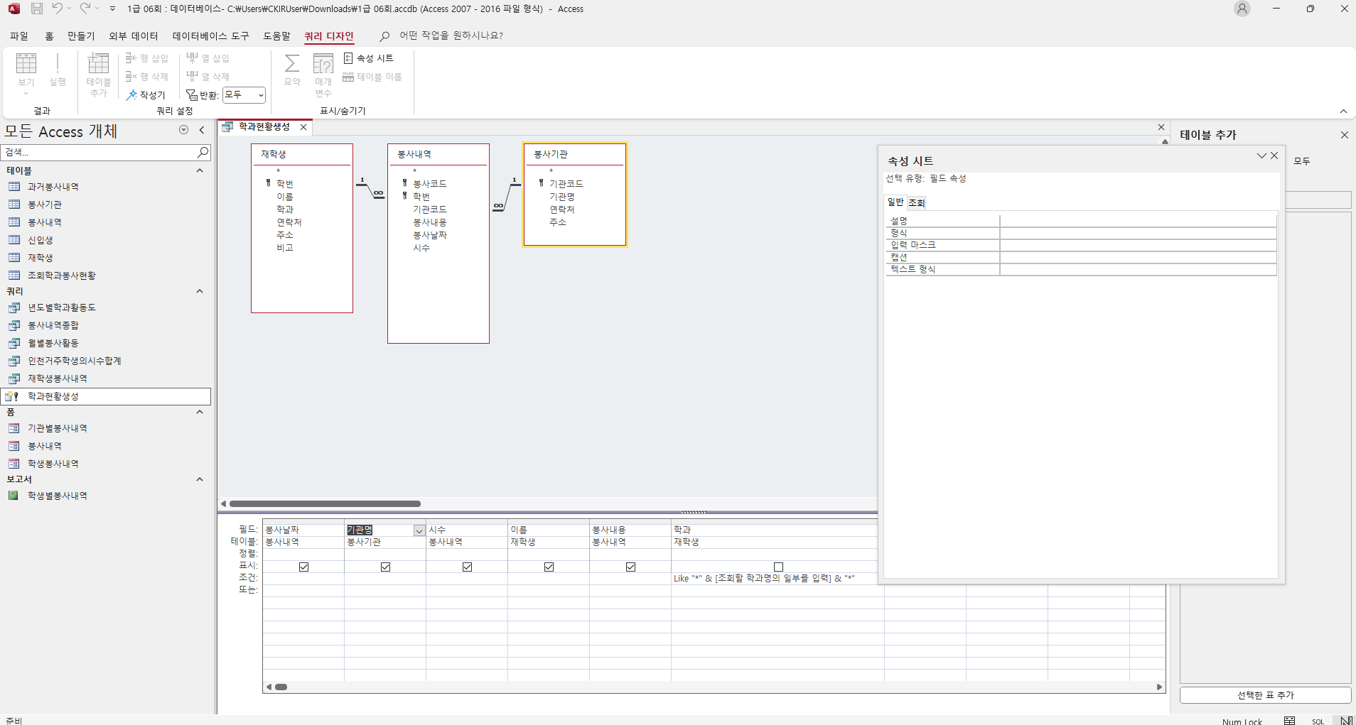 -봉사내역.봉사내용 INTO 조회학과봉사현황 FROM 봉사기관 INNER JOIN (재학생 INNER JOIN 봉사내역 ON 재학생.학번 = 봉사내역.학번) ON 봉사기관.기관코드 = 봉사내역.기관코드 WHERE (((재학생.학과) Like "*" & [조회할 학과명의 일부를 입력] & "*")); )과 다릅니다.
