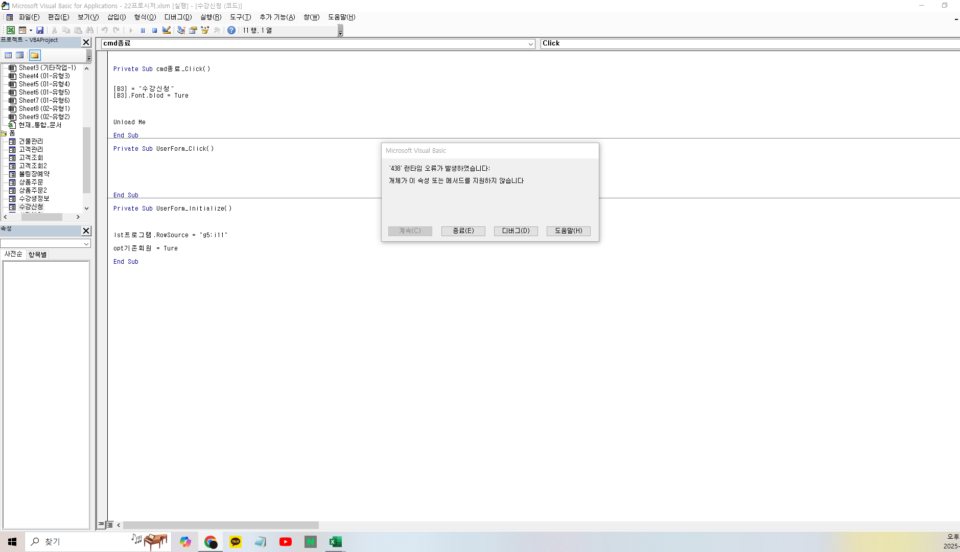 기출1번 3번문제에서 폼이 종료할때 계속해서 이런 오류창이 뜨는데 어느부분이 잘못되었는지 잘 모르겠습니다.