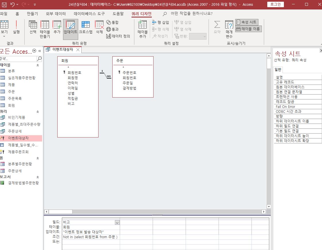 -쿼리 비교 X [이벤트대상자] 쿼리 (UPDATE 회원 INNER JOIN 주문 ON 회원.회원번호 = 주문.회원번호 SET 회원.비고 = "이벤트 정보 발송 대상자" WHERE (((회원.비고) Not In (select 회원번호 from 주문 ))); )이 정답(UPDATE 회원 SET 회원.비고 = "이벤트 정보 발송 대상자" WHERE (((회원.회원번호) Not In (select 회원번호 from 주문))); )과 다릅니다.