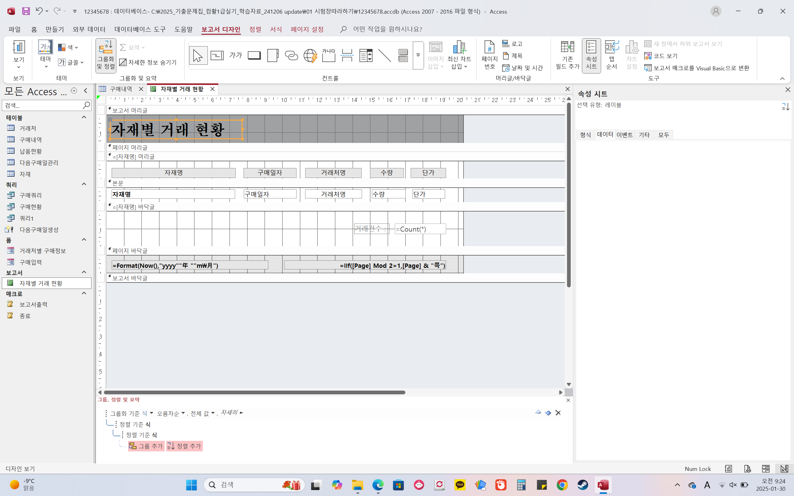 자재명과 구매일자를 오름차순으로 정렬하라고 되어있어 정답에 맞게 정렬 후 이후 과정을 진행하였는데, 채점 후 검토할 때 다시보니 그룹화 기준과 정렬 기준이 모두 식으로만 표현되어있고, 식만 선택할 수 있게 되어있습니다. 왜 이런 결과가 나타나게 되었는지 여쭙니다.