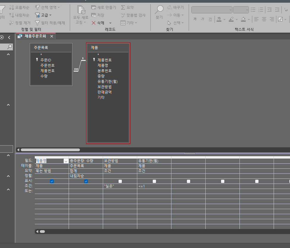 -Sum(주문목록.수량) AS [총 주문량] INTO 실온제품주문현황 FROM 제품 INNER JOIN 주문목록 ON 제품.제품번호 = 주문목록.제품번호 WHERE (((제품.보관방법)="실온") AND ((제품.[유통기한(월)])<=1)) GROUP BY 제품.제품명 ORDER BY Sum(주문목록.수량) DESC; )과 다릅니다.