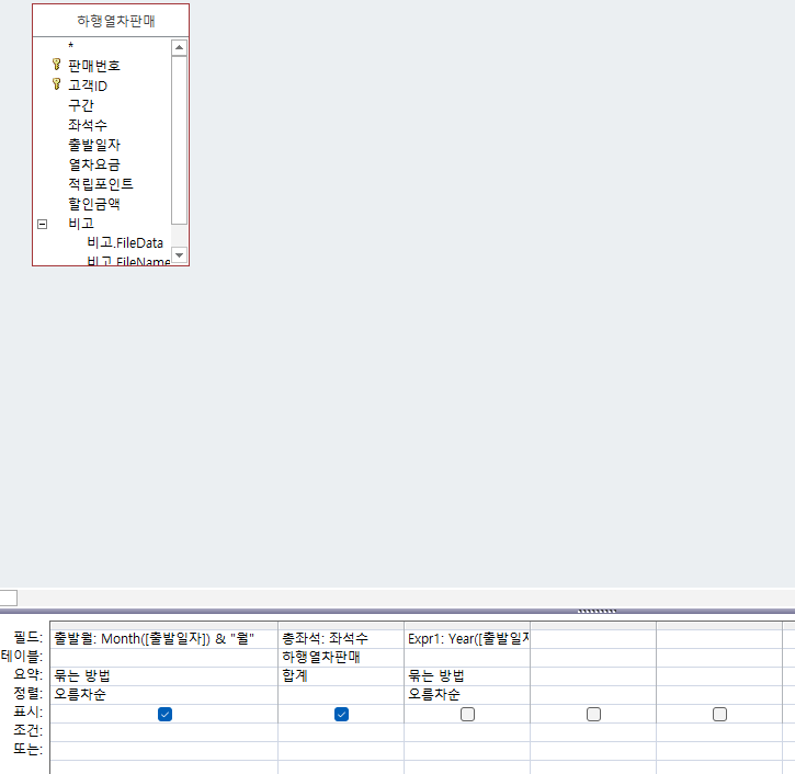 -Sum(하행열차판매.좌석수) AS 총좌석 FROM 하행열차판매 GROUP BY Month([출발일자]) & "월" ORDER BY Month([출발일자]) & "월"; )이 정답(SELECT Month([출발일자]) AS 출발월