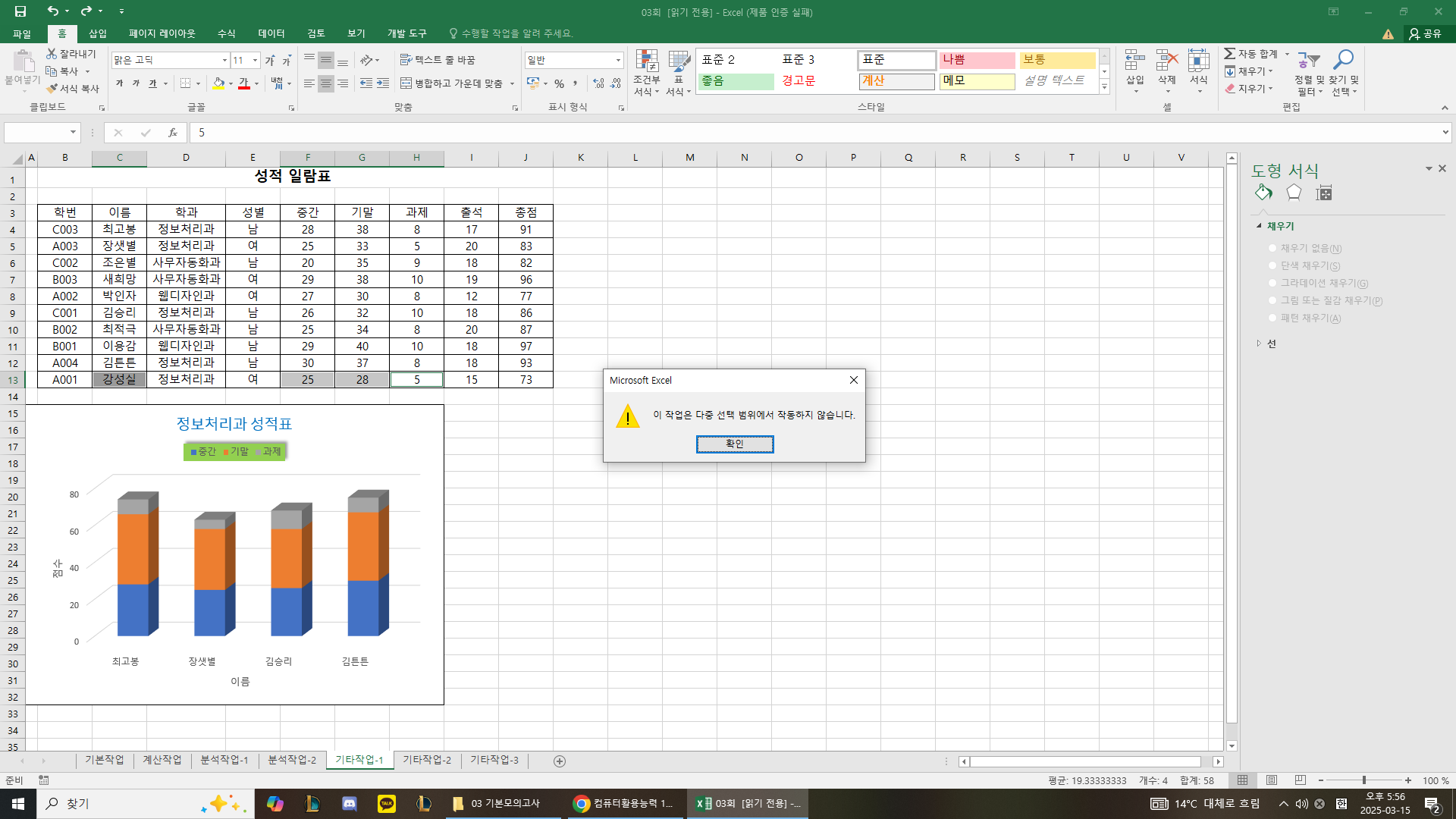 [CTRL]을 누른 상태로 [C13], [F13:H13] 영역을 선택하면 [CTRL]을 누를 때 셀 포인터가 있던 셀까지 범위로 선택되므로 그림과 같은 메시지가 표시되는 것입니다.