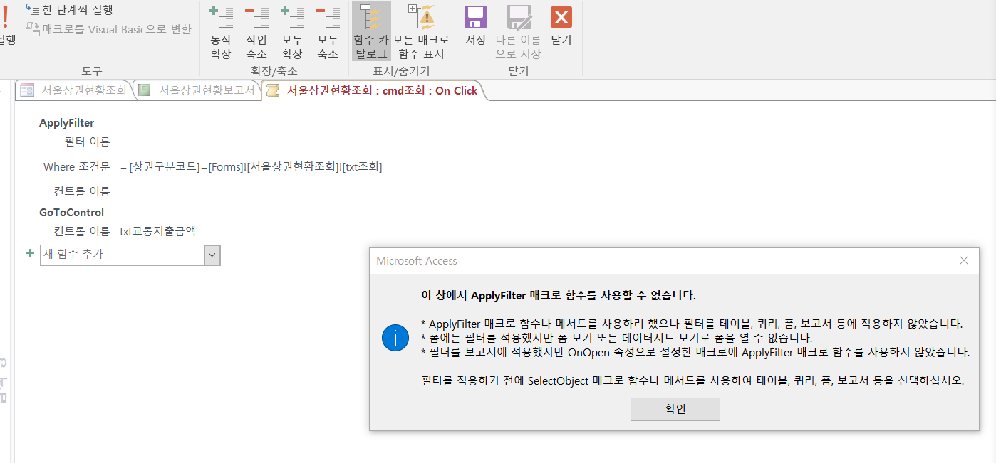 <서울상권현황조회> 폼의 txt조회 컨트롤에 조회할 상품구분코드를 입력한 후 <cmd조회> 단추를 클릭해야 합니다. 이렇게 했는데도 동일한 오류가 발생한다면 그림이 아닌 실습한 액세스 파일을 올려주세요.