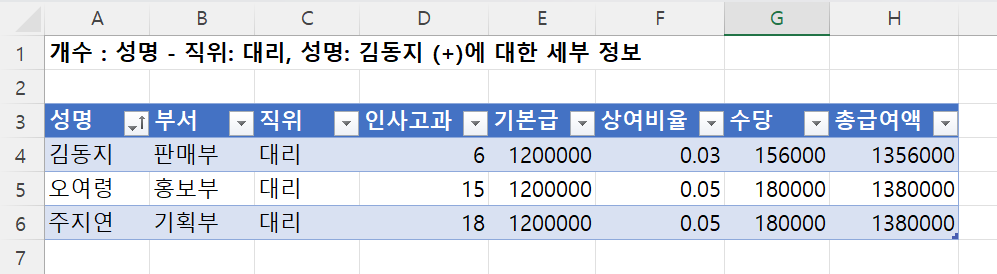 -시트 비교 X [A1]에서의 값이 (개수:성명-직위:대리