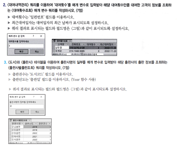 출판사명의 일부를 입력받아 해당 내용이 포함되는 데이터를 조회해야 하므로 이 문제에서는 LKIE를 사용해야 하지만 ‘대여횟수’를 매개 변수로 받아 이 값과 동일한 데이터를 찾을 때는 LIKE를 사용하지 않습니다.