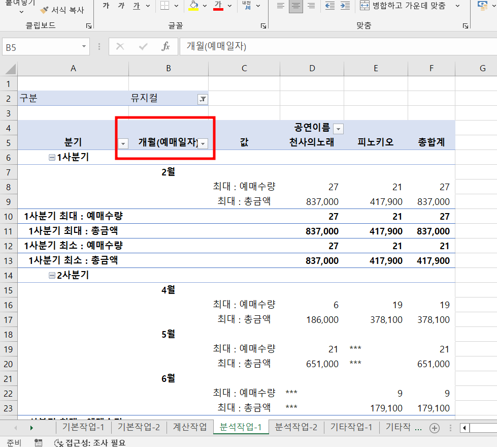 => 개월(예매일자) 부분을 '예매일자'로 변경하면 피벗테이블 형식이 깨져버리는데 문제 처럼 분기 / 예매일자 로 표현 할수있는 방법이 궁금합니다.
