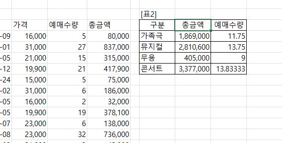 예매수량 평균, 총금액 합계 순서로 계산하는 것이긴 합니다만