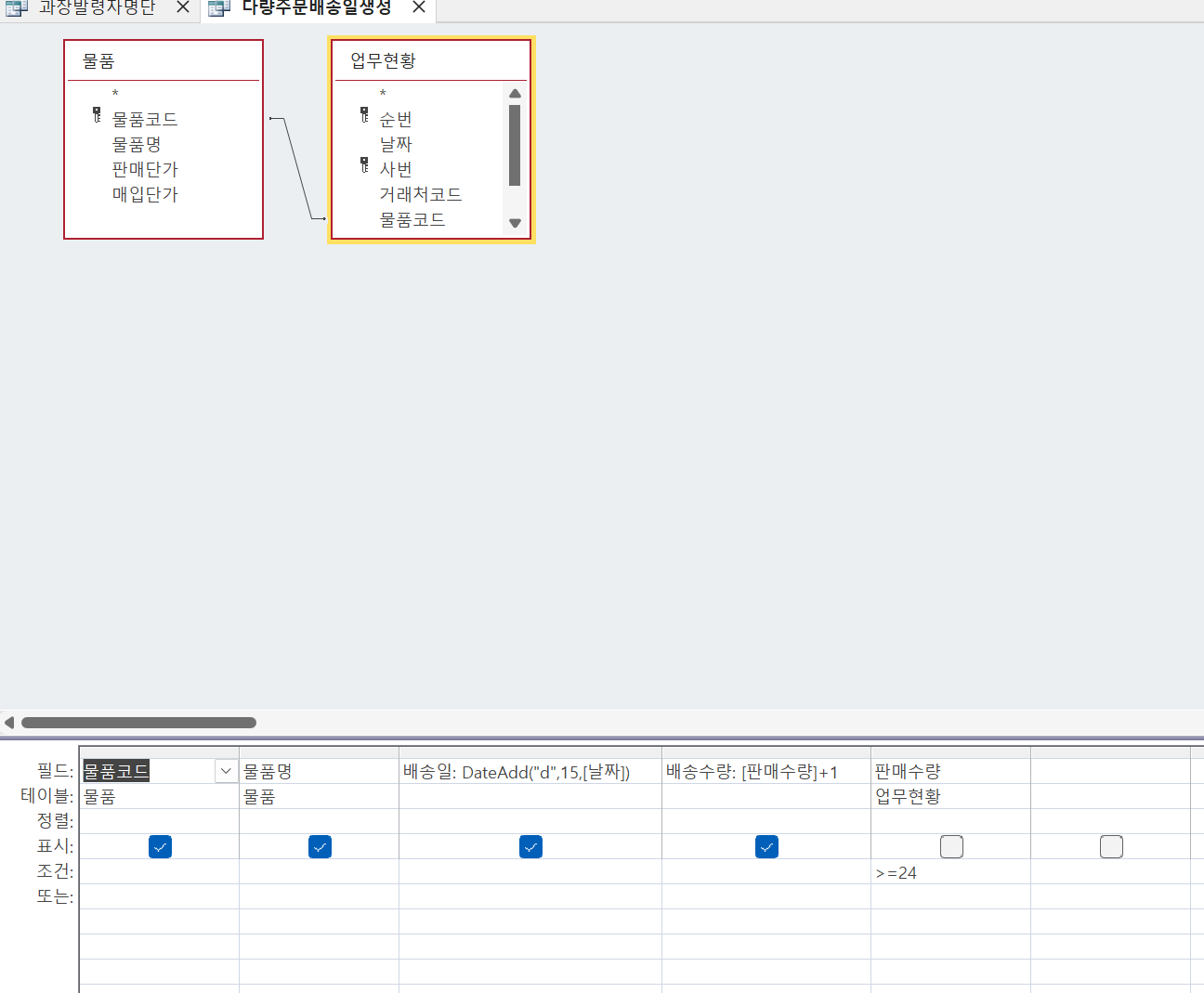 쿼리 비교 X [다량주문배송일생성] 쿼리 (SELECT 물품.물품코드, 물품.물품명, DateAdd("d",15,[날짜]) AS 배송일, [판매수량]+1 AS 배송수량 FROM 물품 INNER JOIN 업무현황 ON 물품.물품코드 = 업무현황.물품코드 WHERE (((업무현황.판매수량)>=24)); )이 정답(SELECT 물품.물품코드, 물품.물품명, DateAdd("d",15,[날짜]) AS 배송일, [판매수량]+1 AS 배송수량 INTO 다량주문배송관리 FROM 물품 INNER JOIN 업무현황 ON 물품.물품코드 = 업무현황.물품코드 WHERE (((업무현황.판매수량)>=24)); )과 다릅니다.