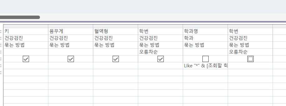 -건강검진.학번 HAVING (((학과.학과명) Like "*" & [조회할 학과명의 일부를 입력] & "*")) ORDER BY 건강검진.학번; )이 정답(SELECT 건강검진.이름
