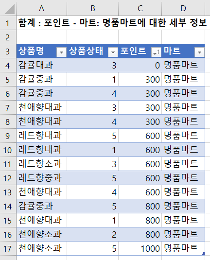 분석작업-1시트에서 "명품마트 요약" 중 "합계:포인트" 더블클릭하여 별도의 시트에 작성하였습니다. 그랬더니 [A1]셀에 "합계 : 포인트 - 마트: 명품마트에 대한 세부 정보" 가 자동 입력되어있고 데이터는 [A3]셀부터 입력되어있습니다. 유투브 강의에는 똑같이 작업 했을 때 [A1]셀에 바로 데이터값들이 나오는데 왜 이런건가요 ㅠㅠ 실시험에서도 이러면 10점 날라가는건가요