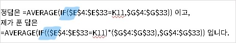 =AVERAGE(IF(($E$4:$E$33=K11)*($G$4:$G$33),$G$4:$G$33))은 옳은 수식이 아닙니다. if 함수에서 조건이 2개일 때 if((조건1)*(조건2), 참)으로 지정하는 것으로 이 문제는 조건이 하나이므로 =AVERAGE(IF($E$4:$E$33=K11,$G$4:$G$33))으로 작성하는 것입니다. 올바른 수식이 아니므로 실제 시험장에서는 감점될 수 있습니다.