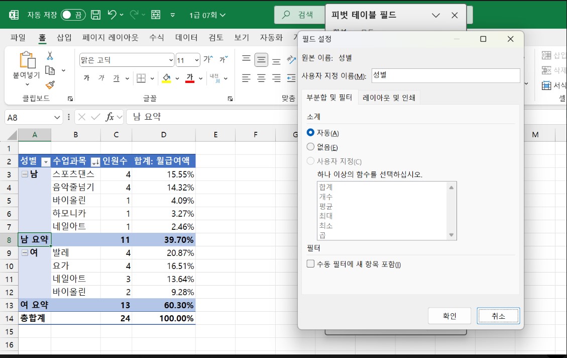 답지에는 필드 설정에서 바꿀 수 있다고 되어 있는데 저는 왜 사용자 지정 부분이 비활성화 되어 있을까요? 아무리 해도 안 되네요.