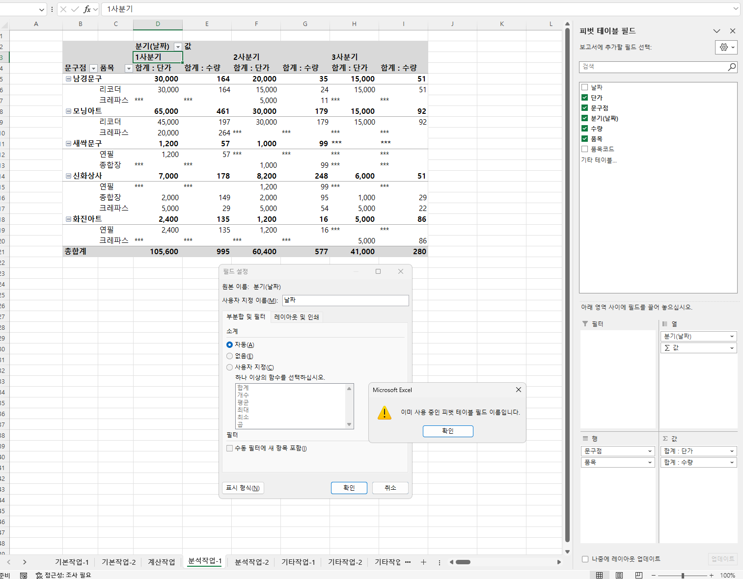 엑셀365버전으로 48p 처럼 진행시 분기(날짜)로 기본 표기되며, 필드 설정에서 날짜로 변경을 하려하면 이미 사용중라고 변경이 불가합니다.