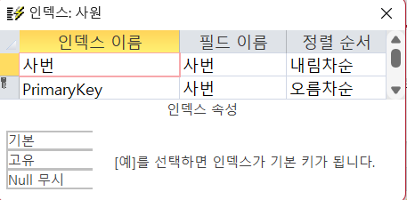 '사번' 필드 인덱스의 고유를 '예'로 설정하는 문제인데, 파일첨부를 보다시피 '예'를 선택하는 상자가 없습니다. 리본메뉴에서 설정하는 건지, 아니면 제 컴퓨터가 이상한건지 질문드립니다.