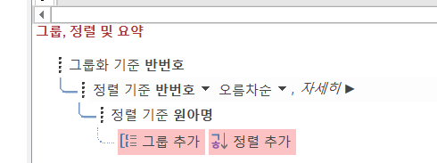 그룹화 기준에서는 그룹화 및 정렬까지 지정됩니다. 이미 반번호 필드로 그룹화가 지정되어 있으니 그 부분에 지정된 정렬 기준을 오름차순으로 변경한 후 <졍렬 추가> 단추를 클릭하여 원아명을 기준으로 내림차순 정렬을 지정하면 됩니다.