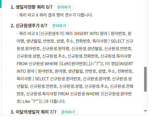 문제엔 LIKE 함수를 사용하라는 말이 없었습니다. 문제는 원아필드가 7로 시작하는 학생만 추가하는 것이었습니다.