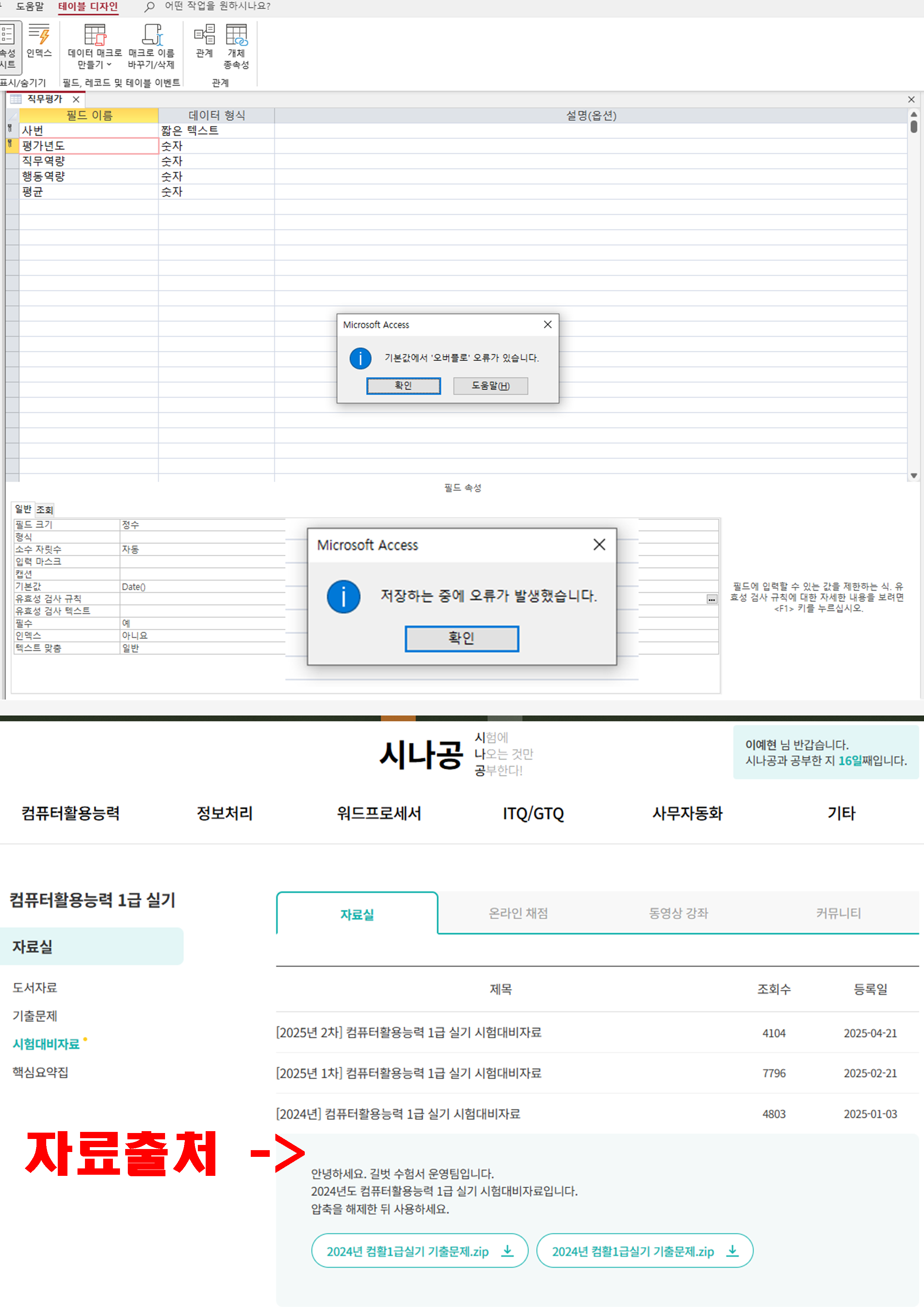 24년상시03 액세스 푸는데 저장할 때마다 오류창이 뜹니다.