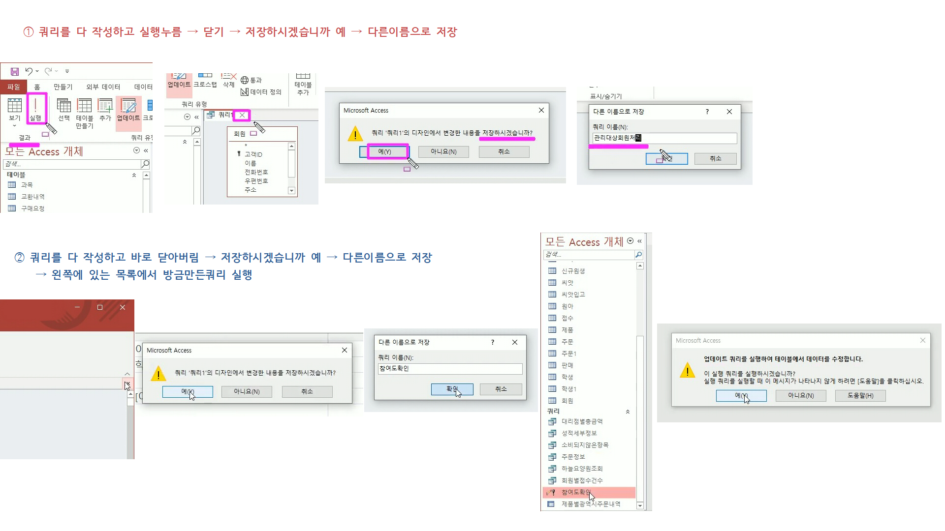 6번 업데이트 쿼리문제 들은 실행→닫기→저장 순서로 마무리했고