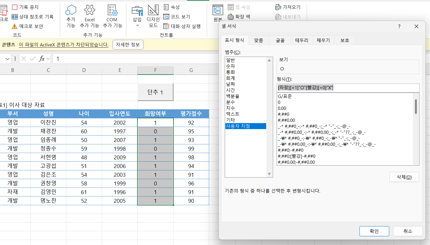 ;이 빠졌네요. [파랑][=1]"O";[빨강][=0]"X"와 같이 수정하세요.