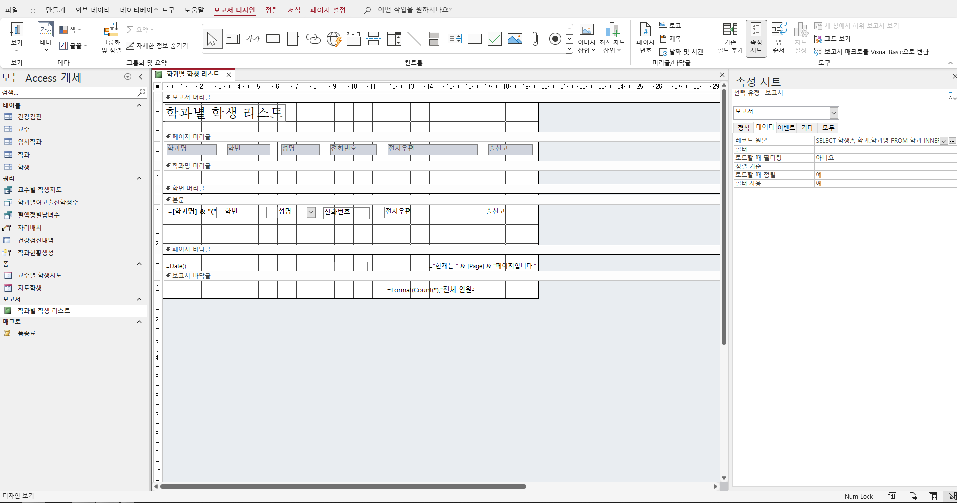 각 필드의 레이블이 페이지마다 상단에 한번씩만 표시되도록 위치를 변경하라고 지시하였습니다. 정답파일과 문제지 정답해설부분에도 '학과명 머리글'과 '본문' 사이에 '학번 머리글'이 존재하지 않는데, 어떻게 해결해야 되나요?