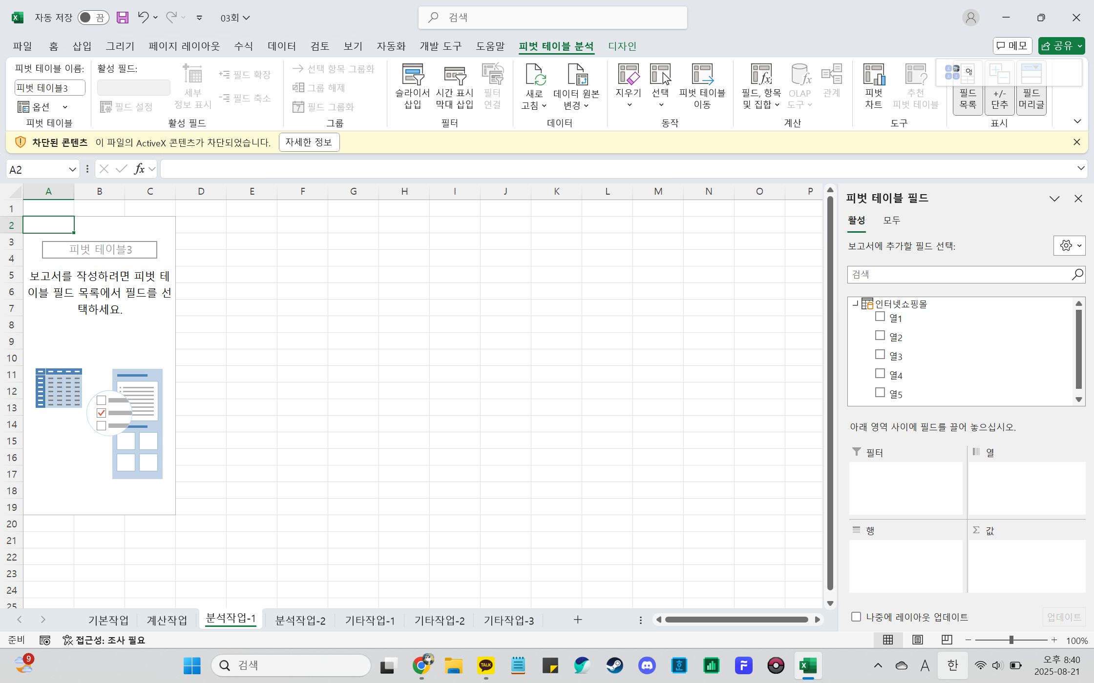 책에 나와있는 대로 피벗 테이블을 추가하고 피벗 테이블 필드에서 필드를 추가하려하는데 필드가 개설일 같은 이름이 아니라 열1, 열2 등으로 표시되어 내용도 전부 1로 표기됩니다 어떻게 해결해야 할까요?
